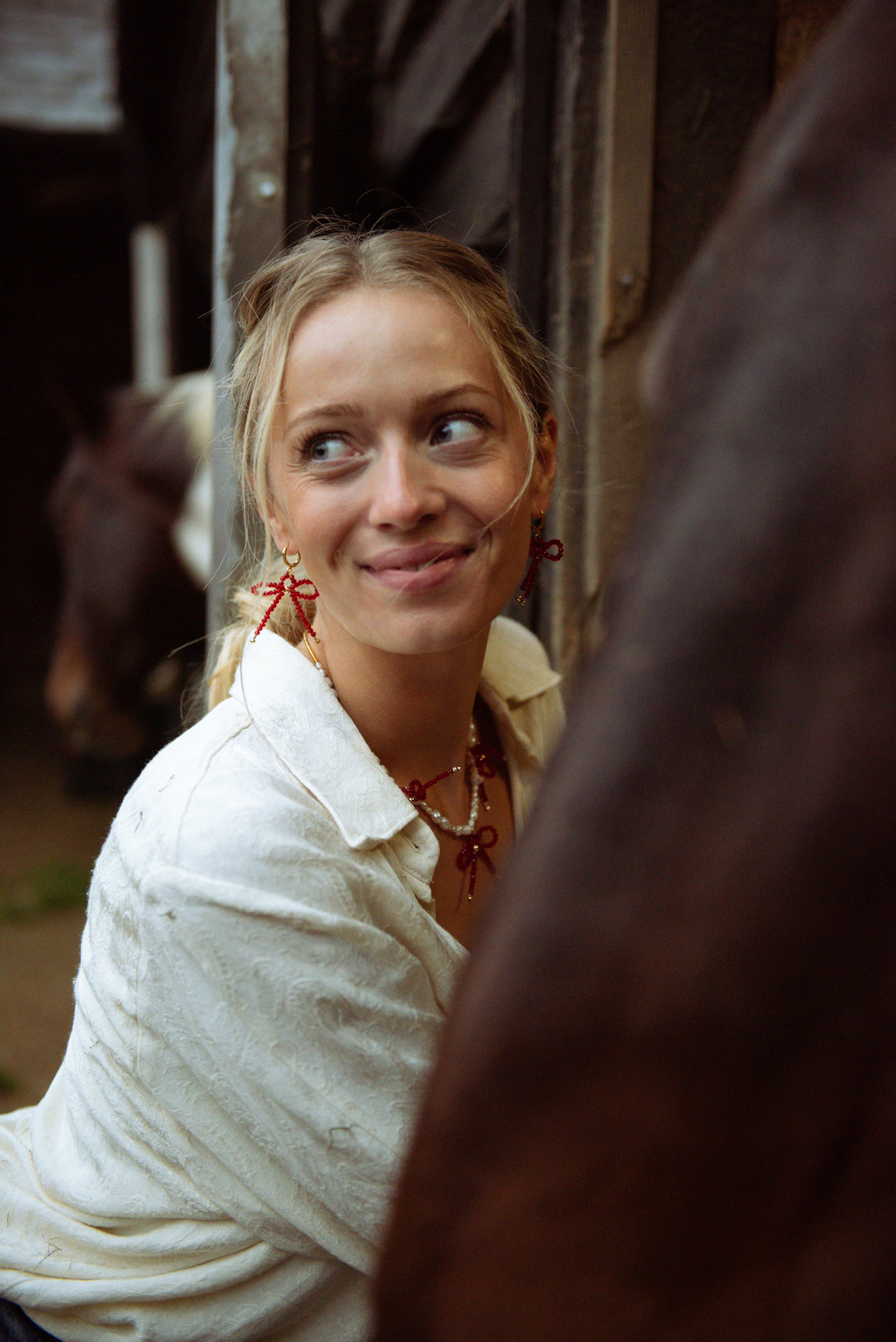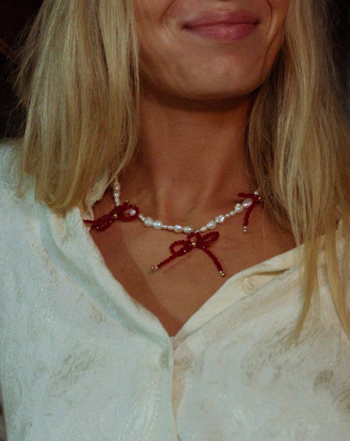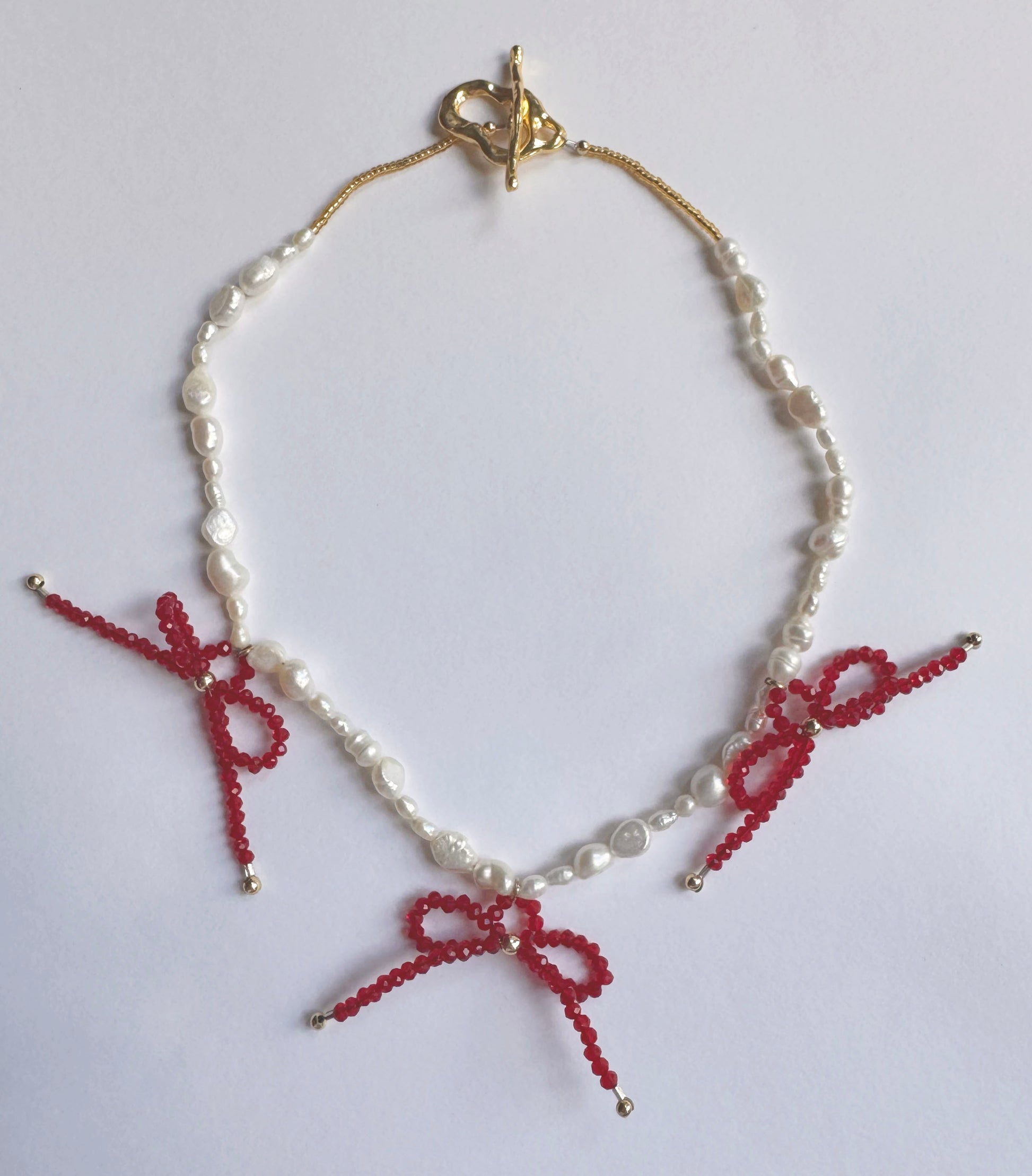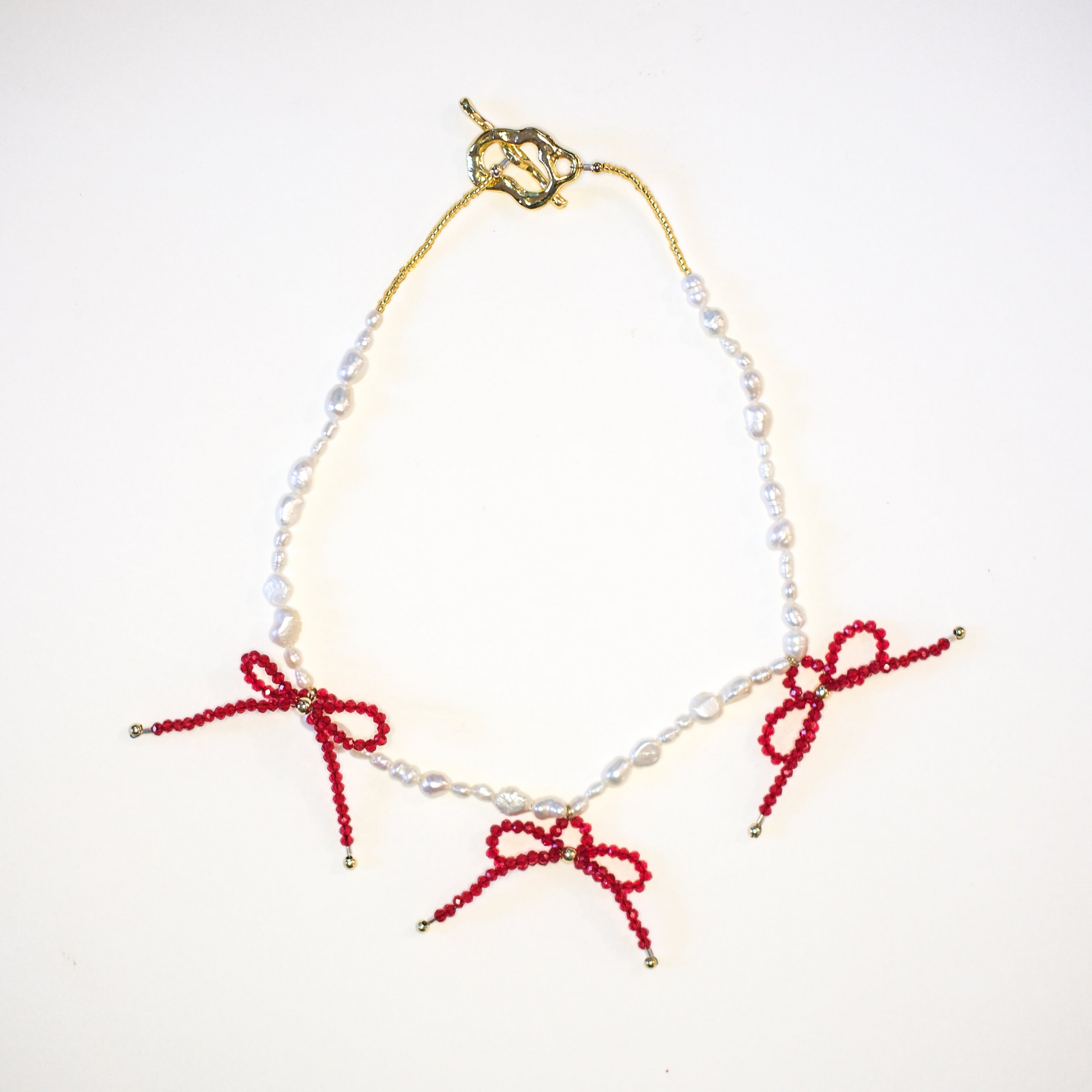 Three cherry red crystal bows sit on a mixed size freshwater pearl necklace that is fastened with a statement gold plated clasp.