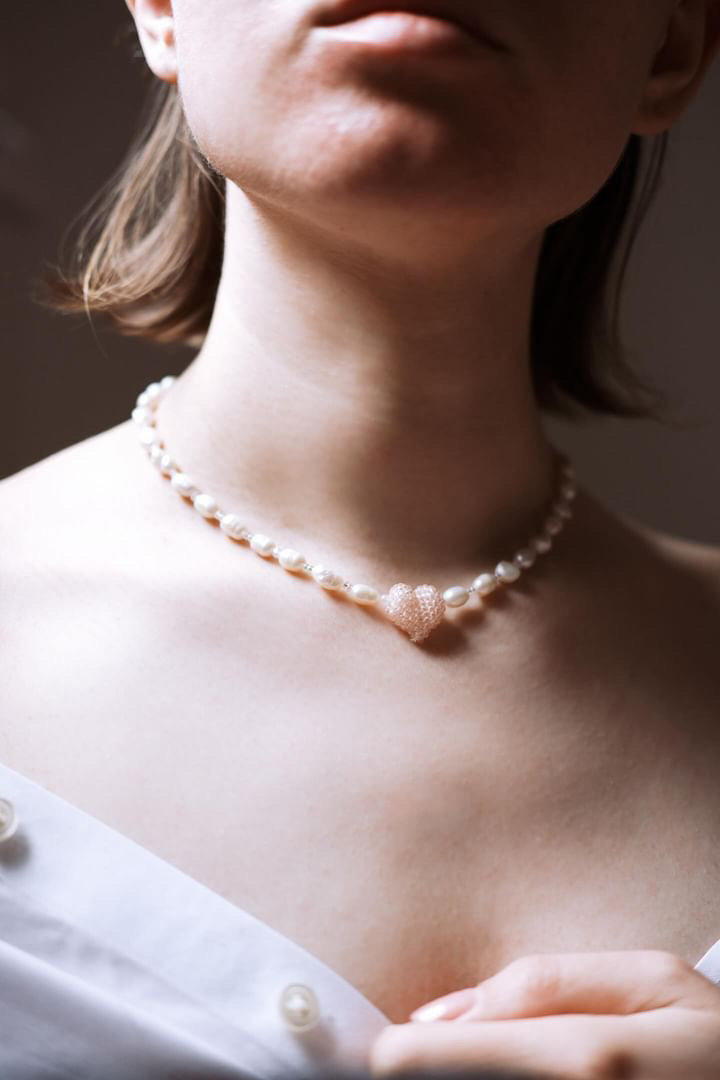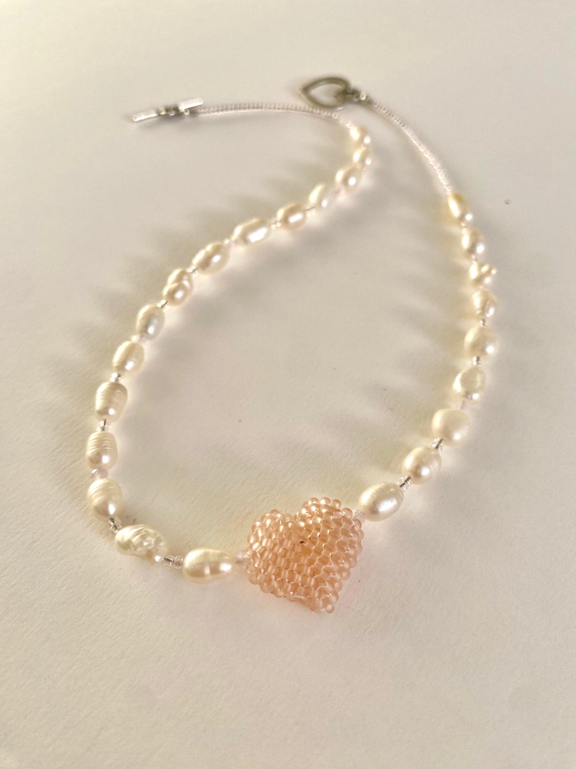 Freshwater pearl necklace with handwoven 3 Dimensional heart charm. Featuring high quality rondelles and pearls, this necklace is sure to attract.