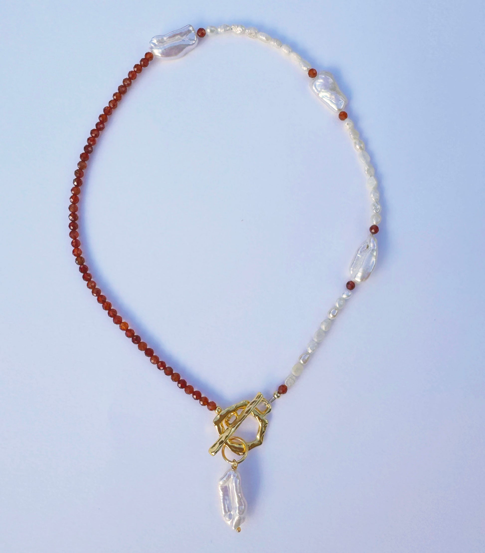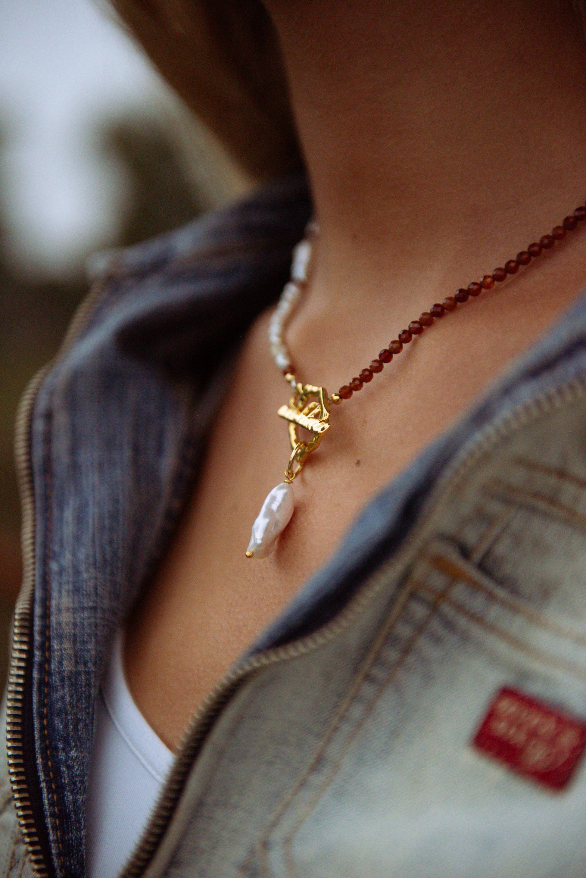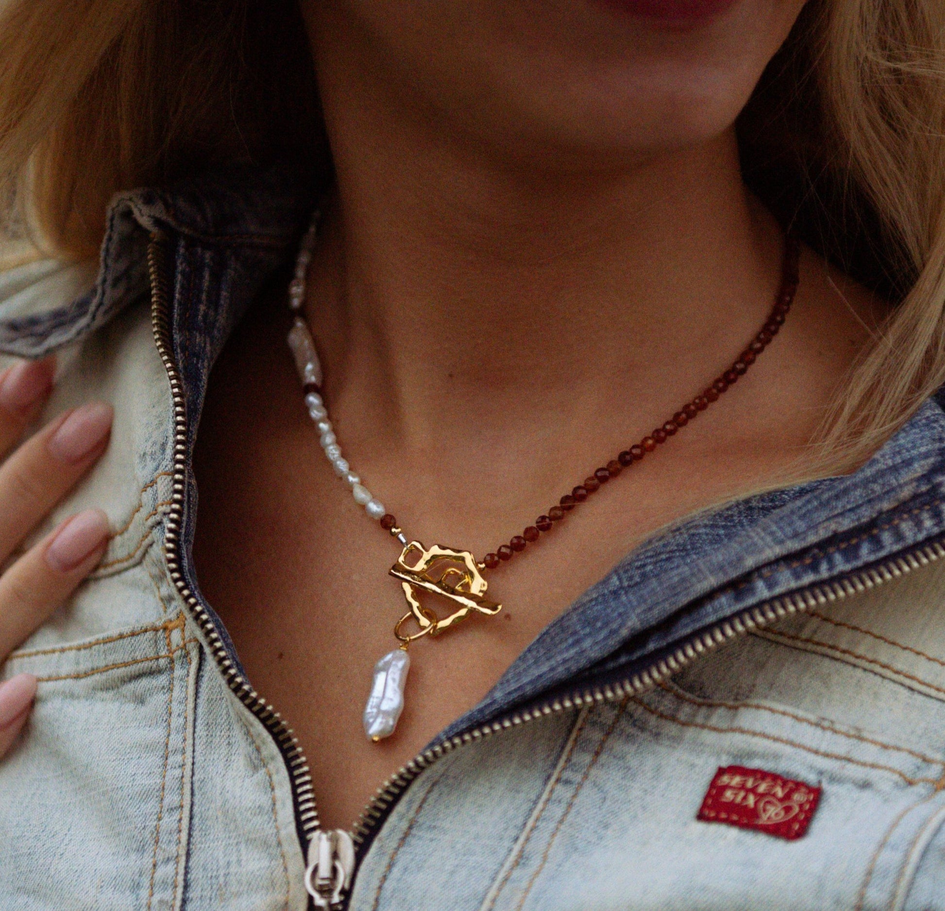 Chunky biwa pearls and garnets sit on this unique necklace. Featuring a front closure in gold plate.
