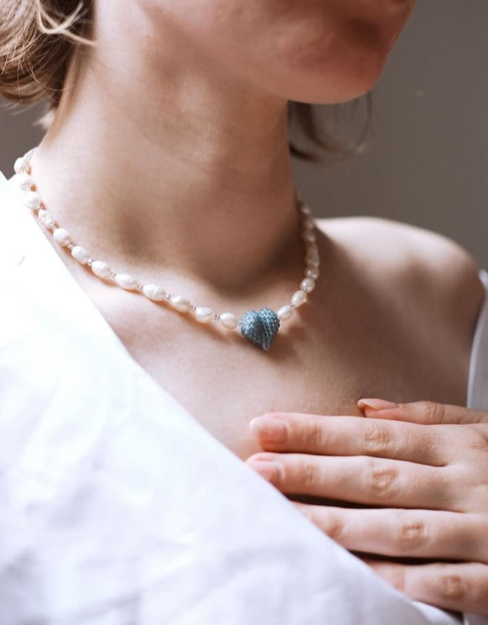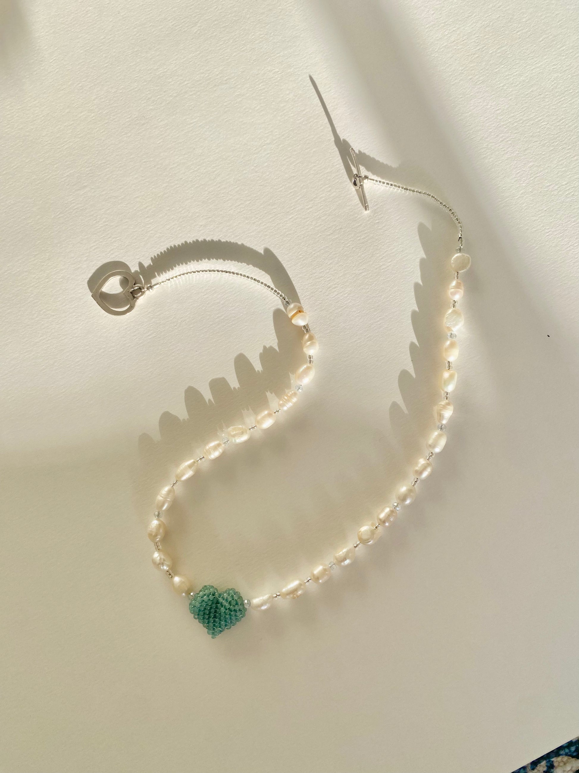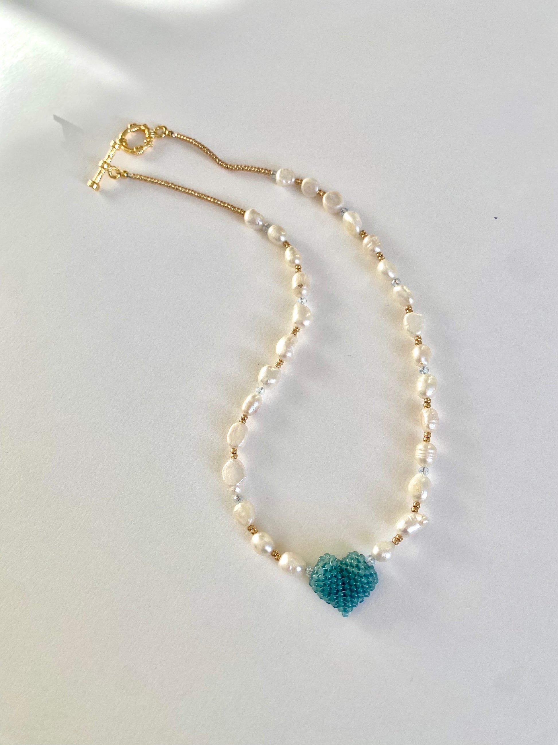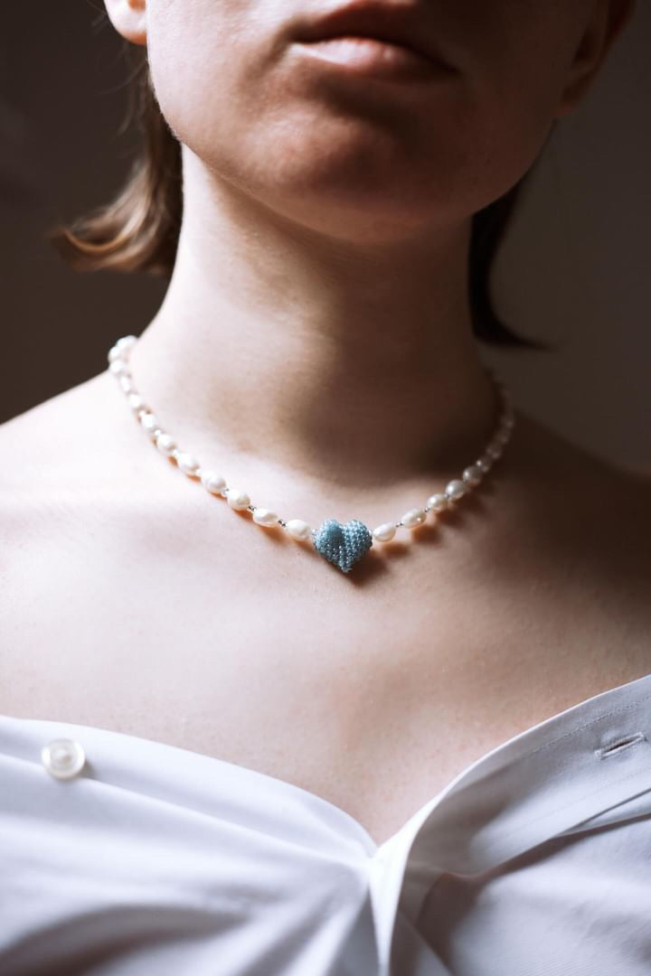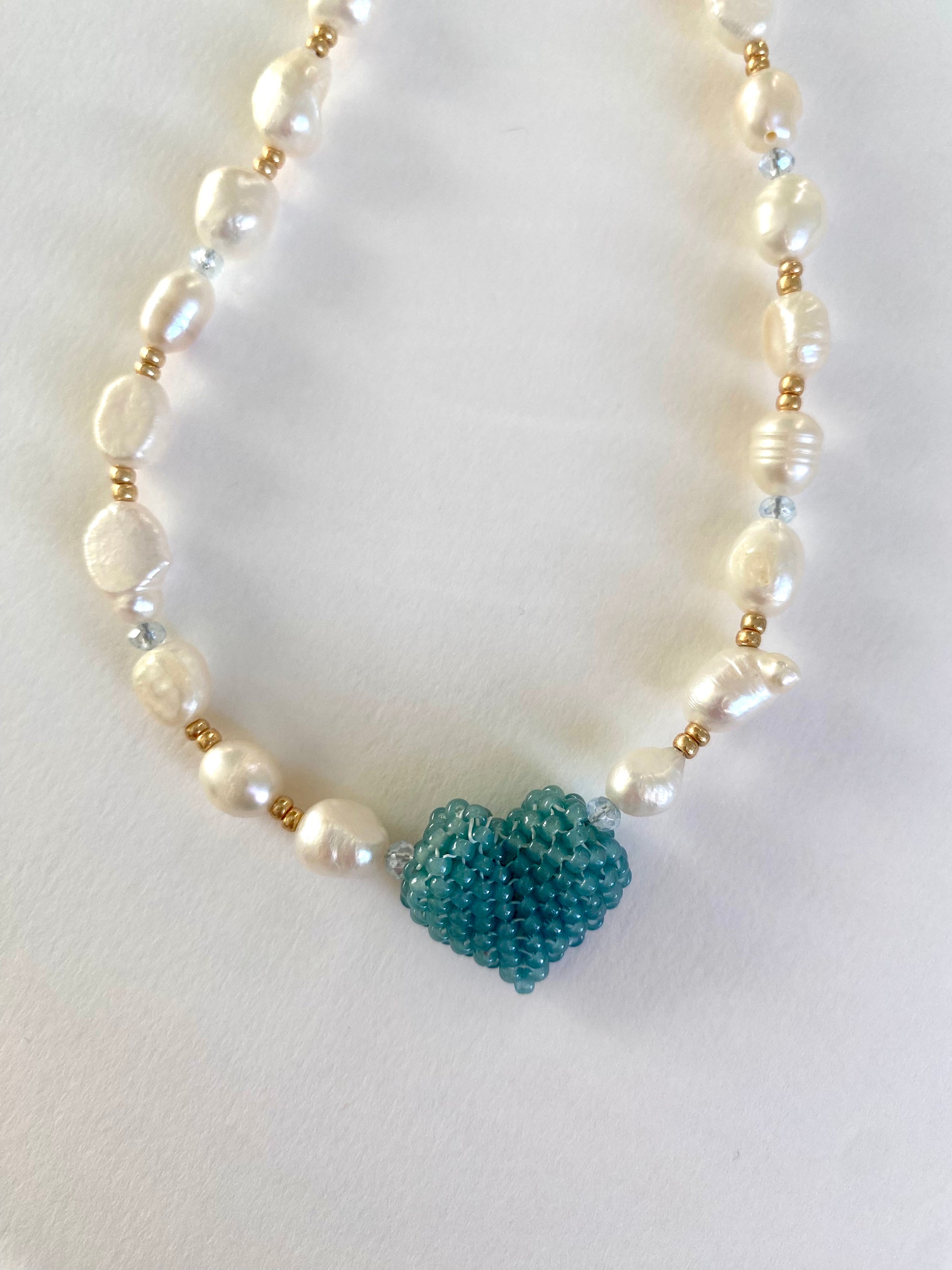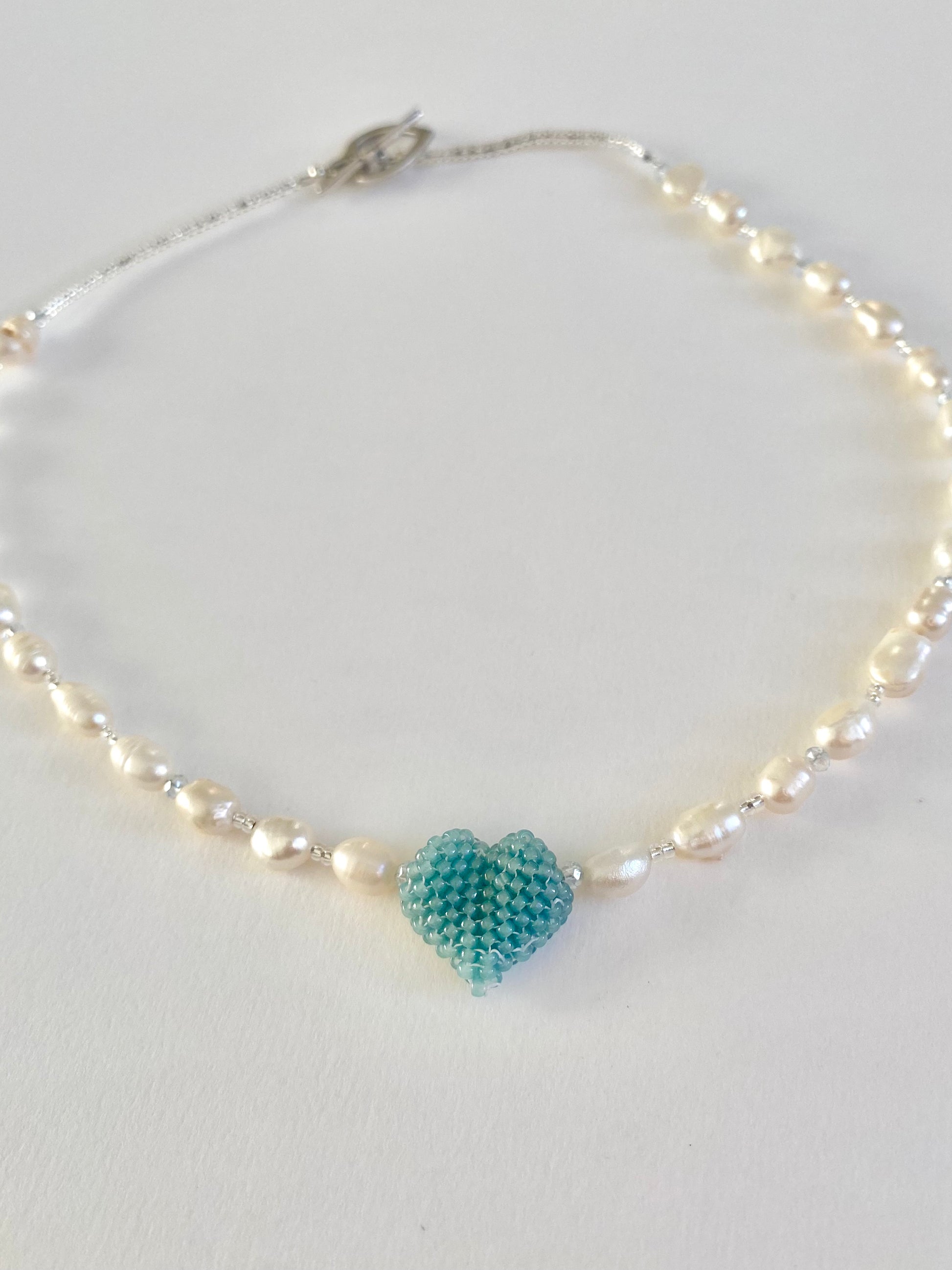 Freshwater pearl necklace with handwoven 3 Dimensional heart charm. Featuring high quality rondelles and pearls, this necklace is sure to attract.