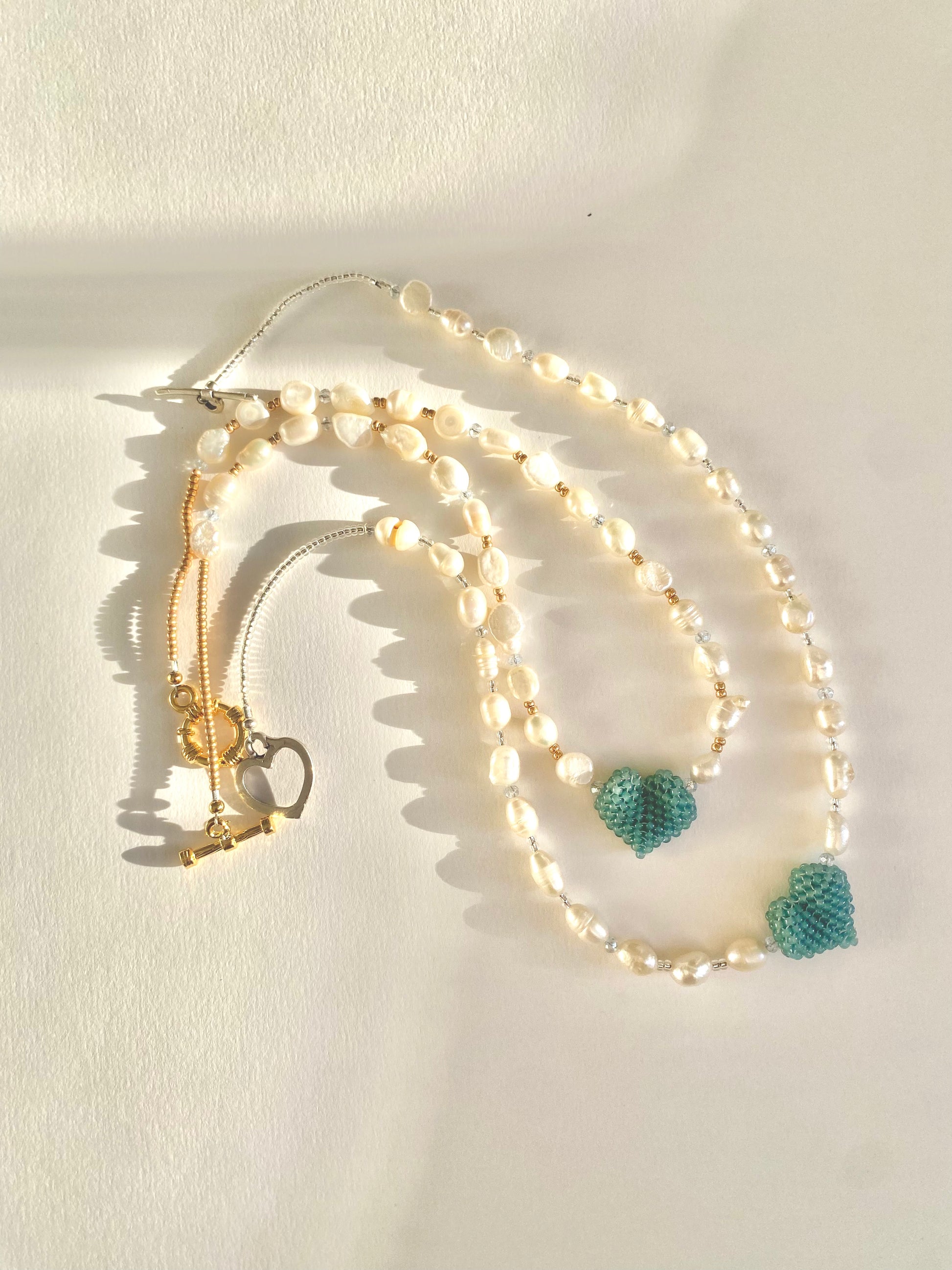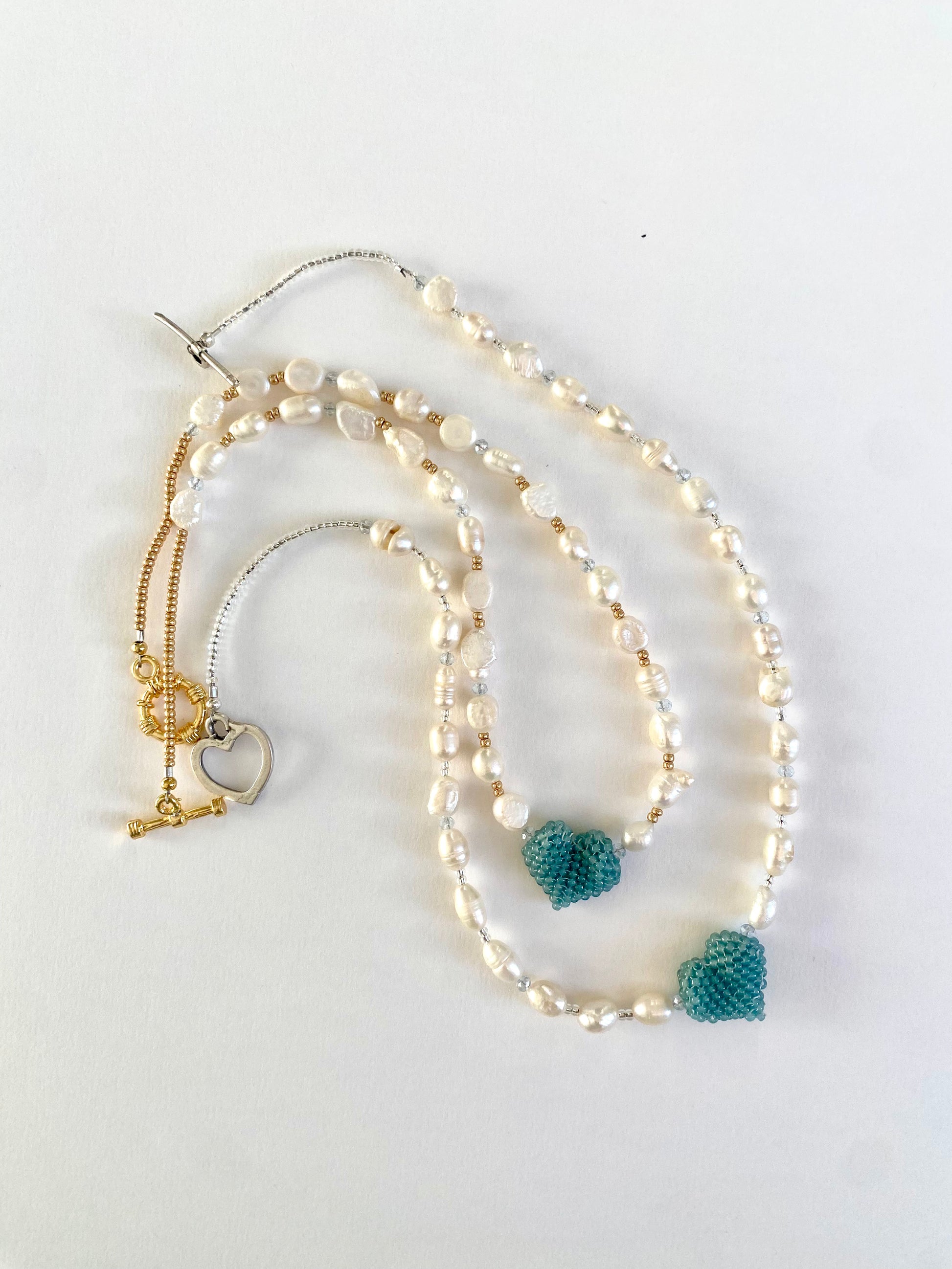 Necklace measures 16 inches and is available in gold plated toggle fastenings, or silver heart fastening.