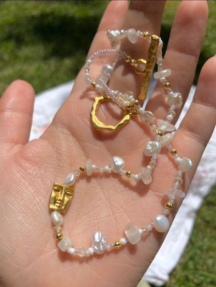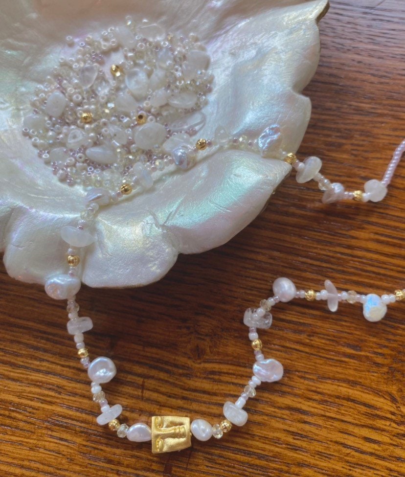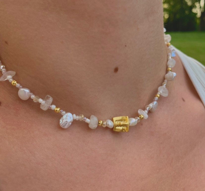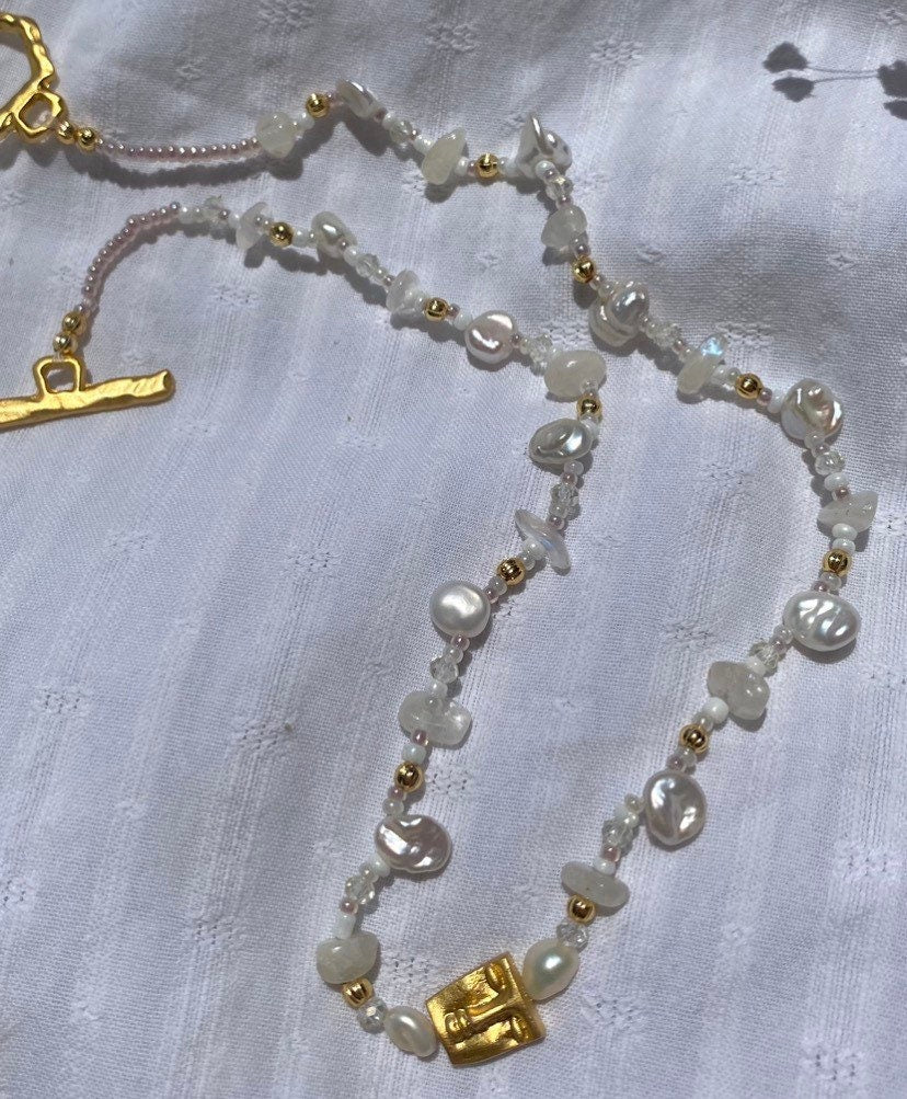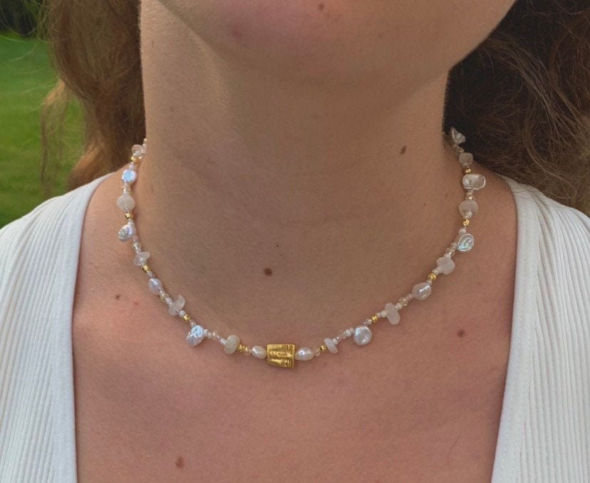 Gorgeous Moonstone, Keshi Pearl necklace featuring a 24karat plated gold clasp and genuine freshwater pearls. Moonstones are known to encourage positive vibes and inner strength, and this necklace measures 16 inches.