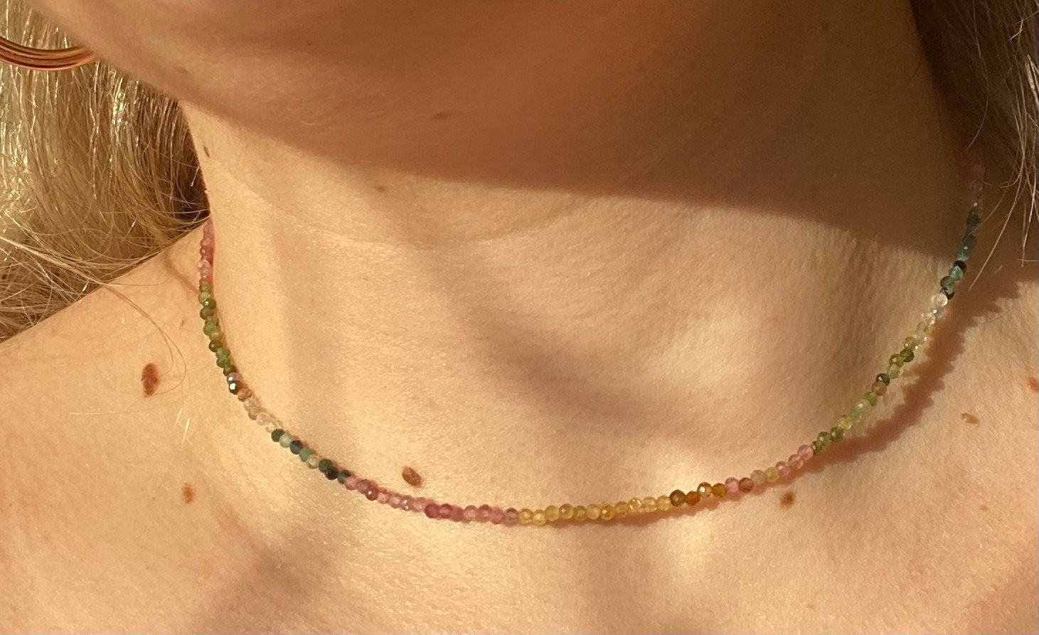 This necklace is made with natural rainbow African Tourmalines. These Tourmalines are rare and absolutely beautiful-glistening in the sun due to the rondelle shape of the beads. The colour of these beads are exquisite and vivid. Tourmaline is known to release tension and protect your energy, as well as being a very grounding mineral. The necklace measures 16 inches but can be customised to suit your needs so please pop me a message xx