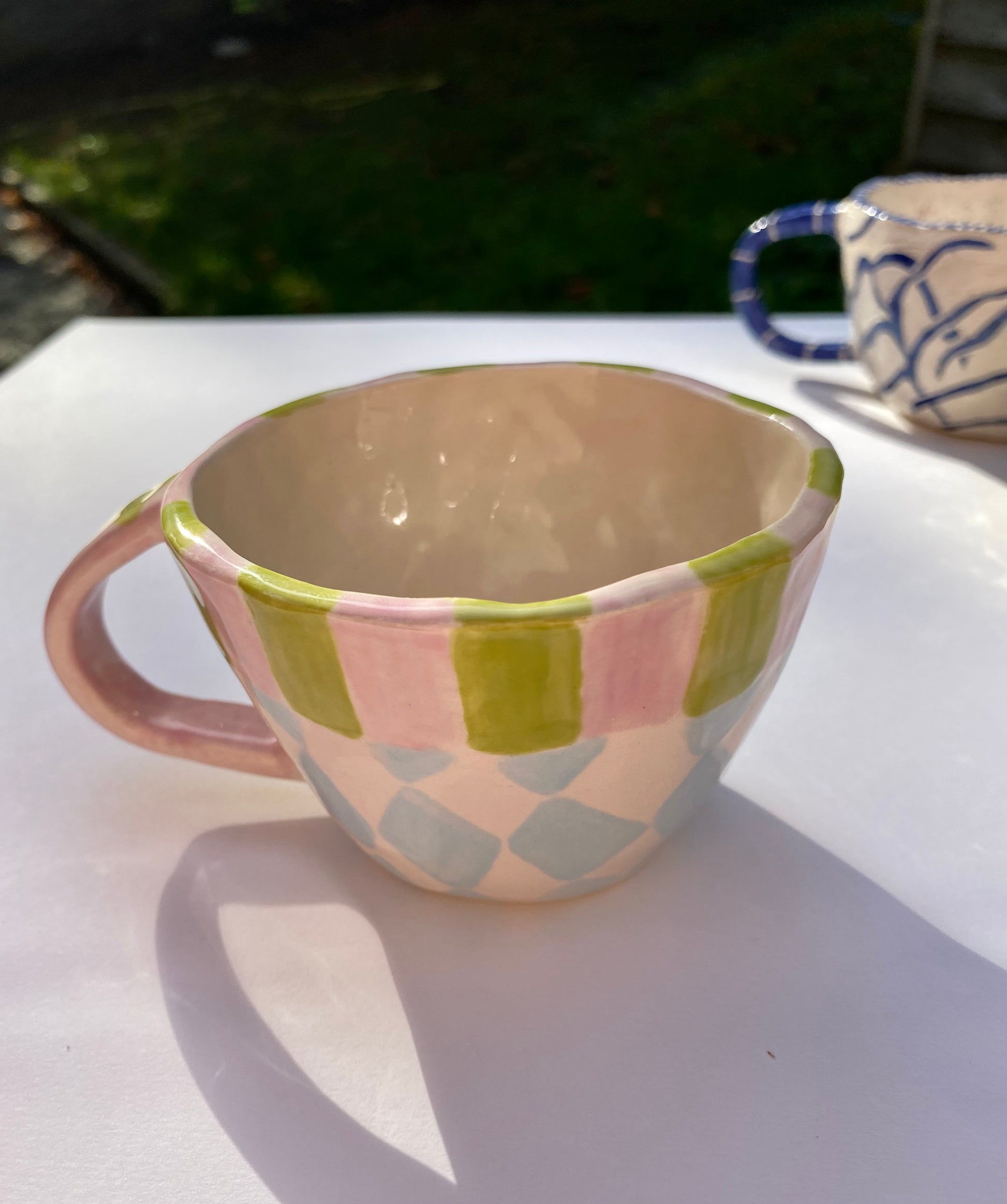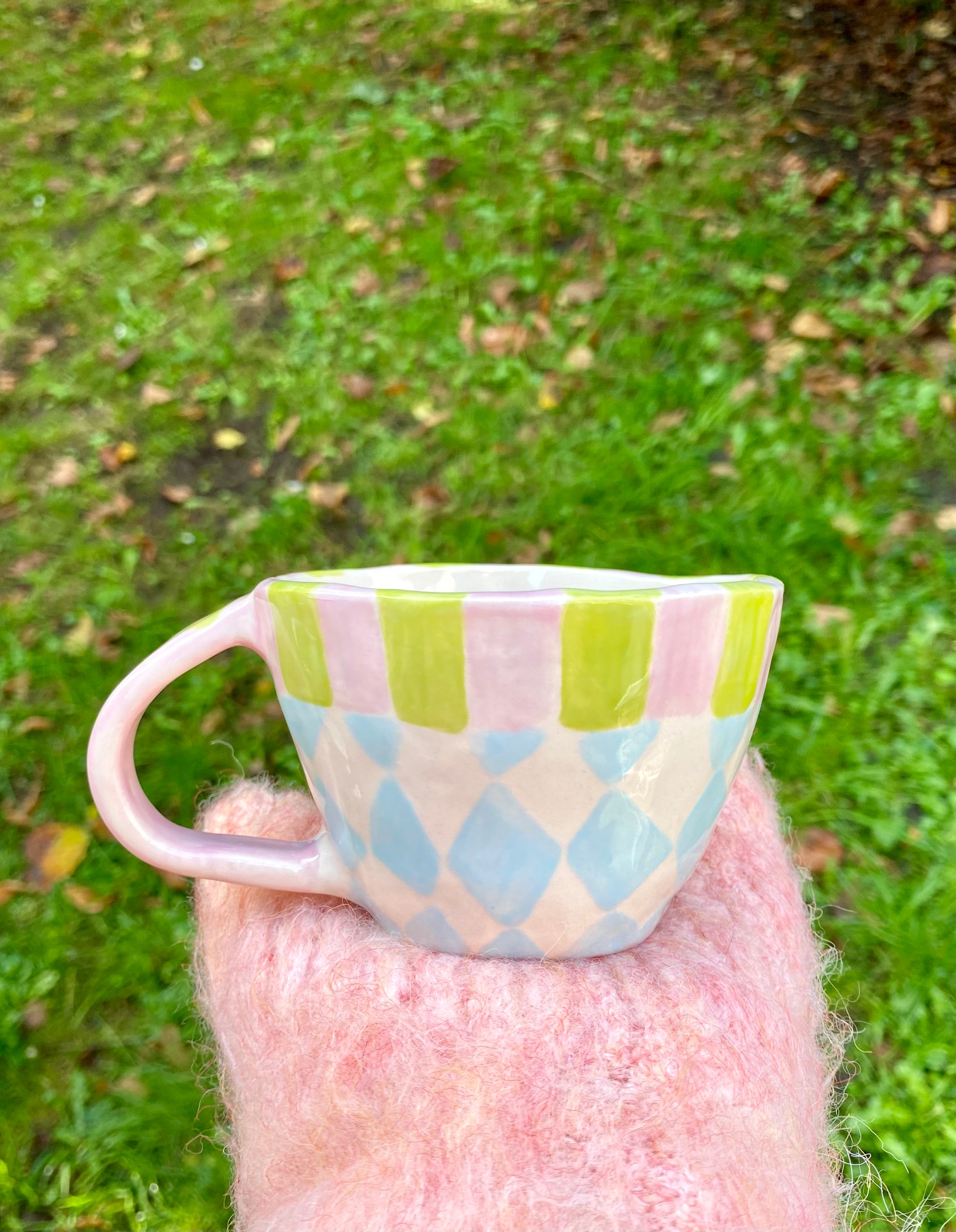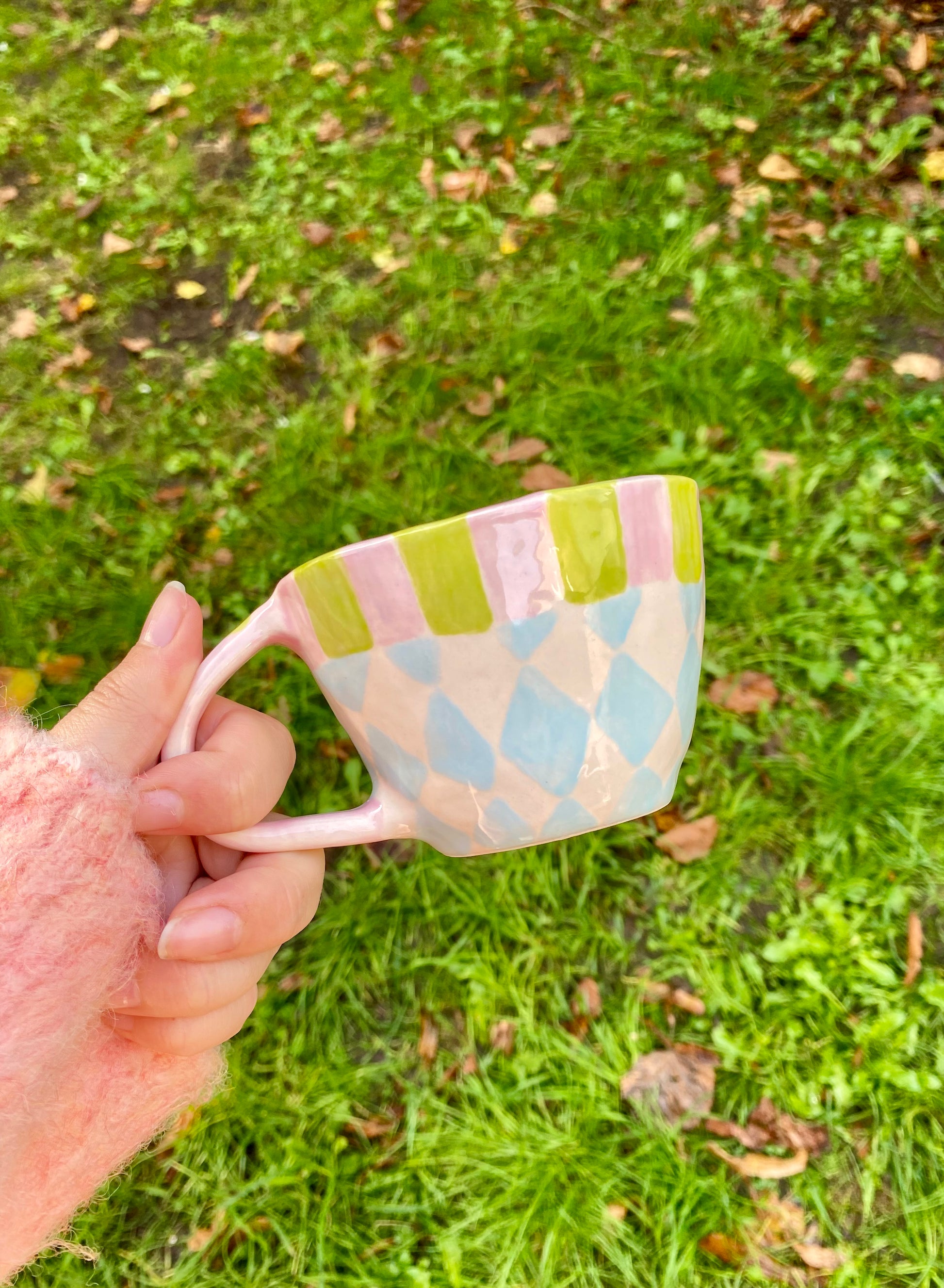 Handmade and hand-painted by me, this mug is painted in a pastel diamond checkered design.