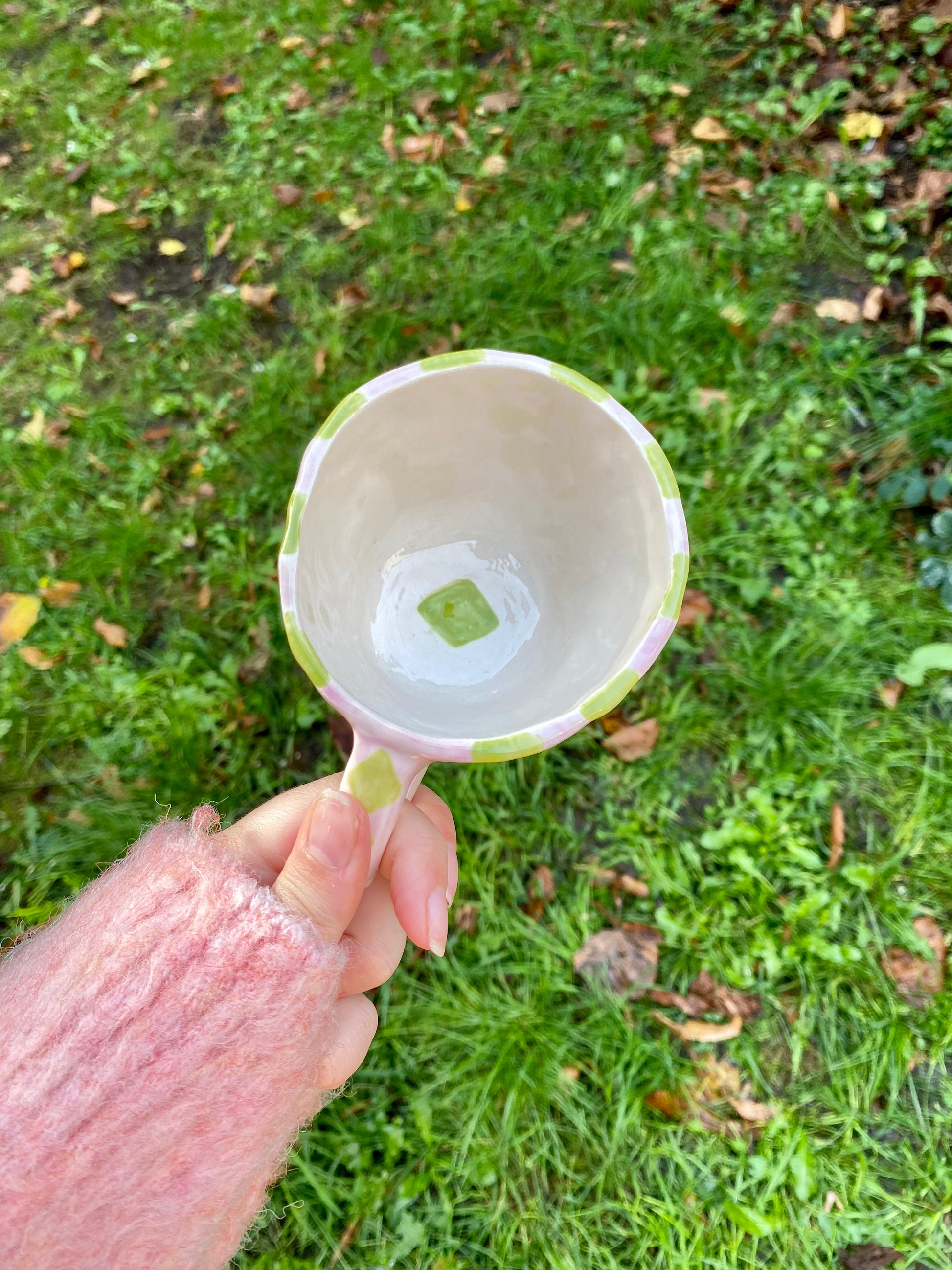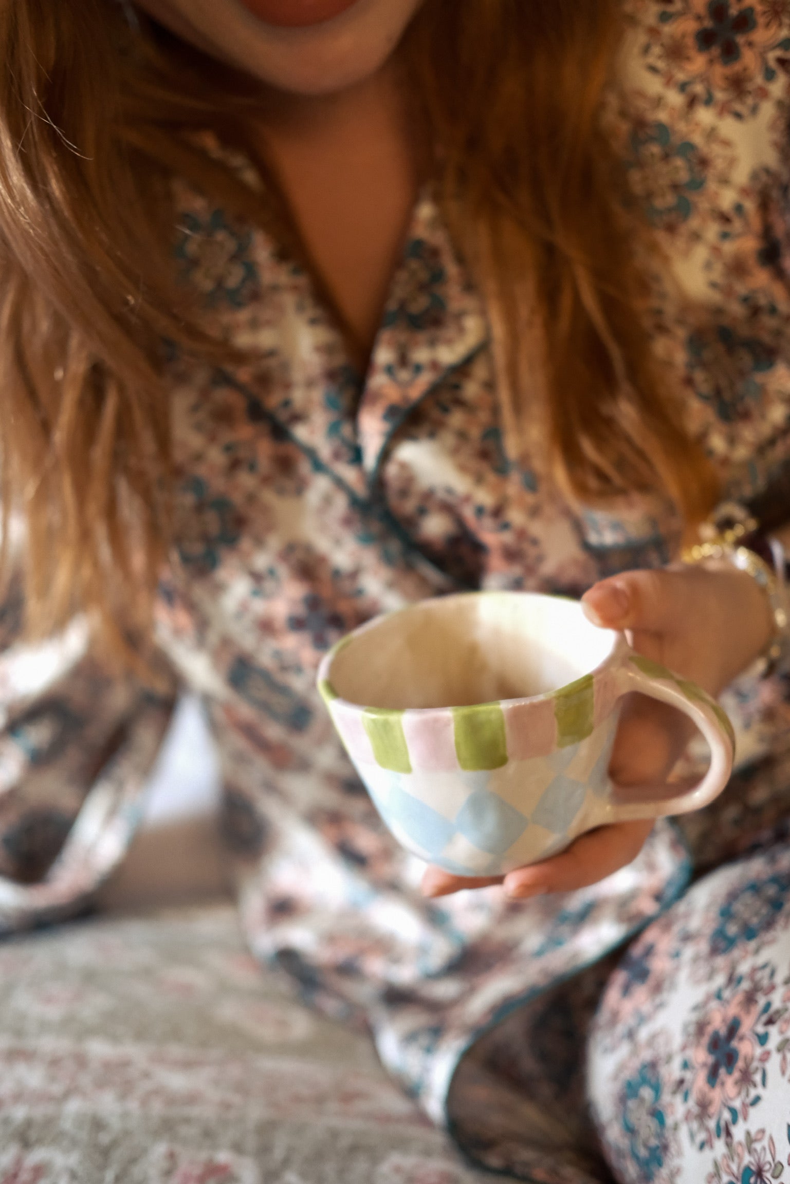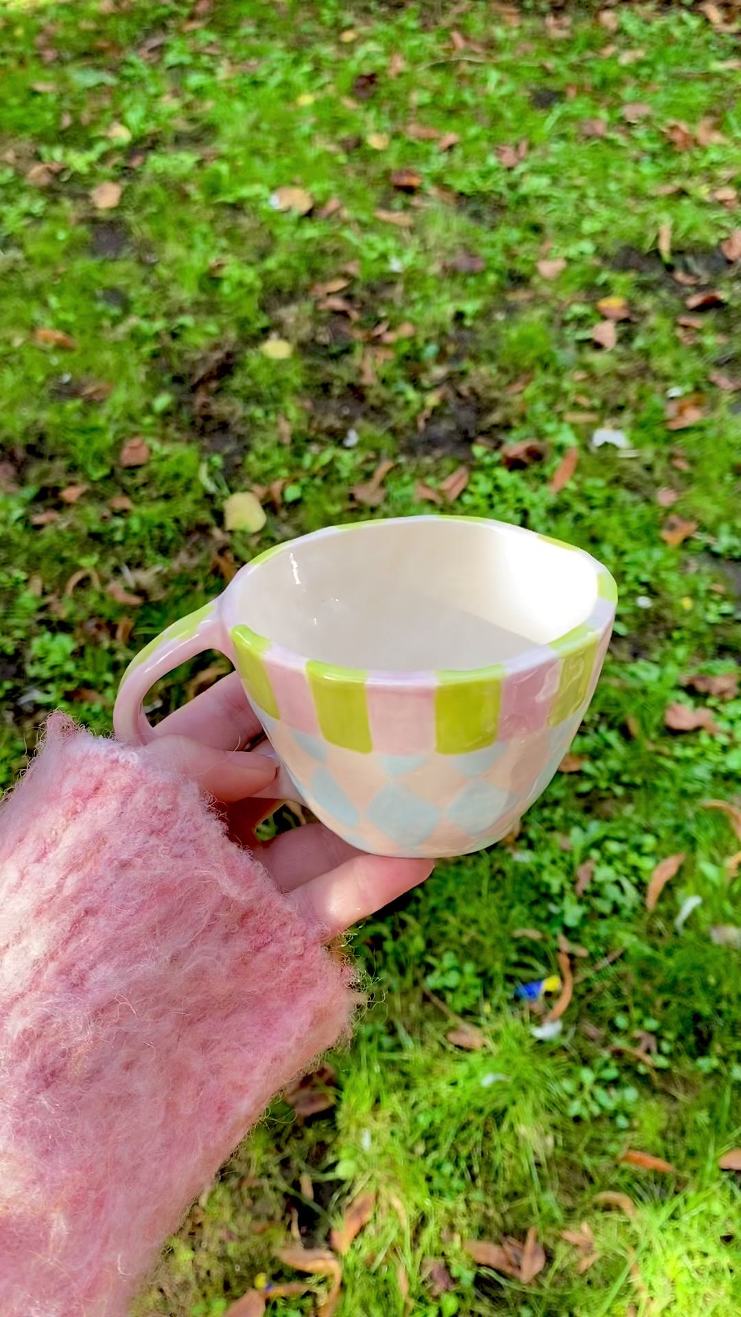 Handmade and hand-painted by me, this mug is painted in a pastel diamond checkered design.
