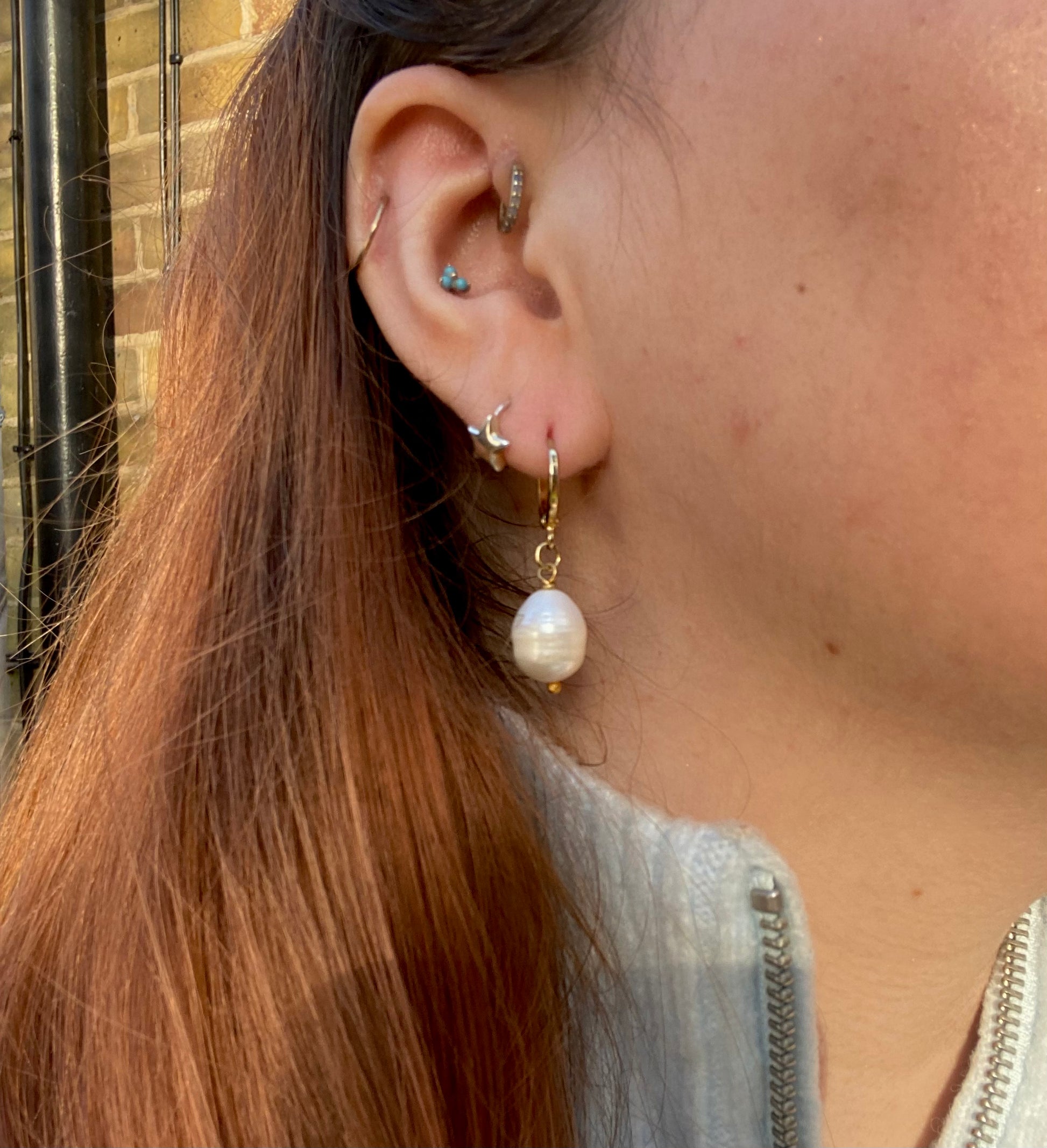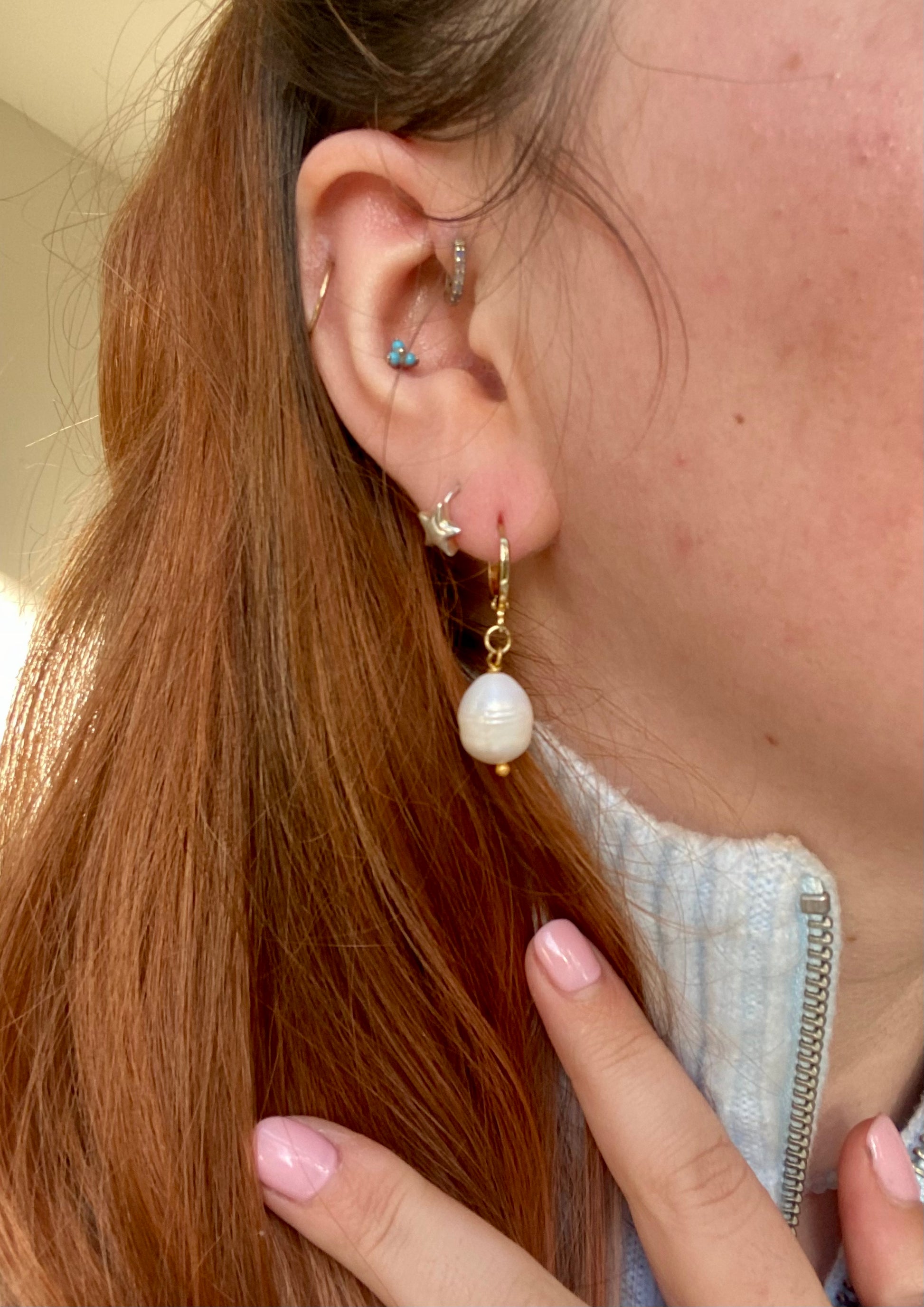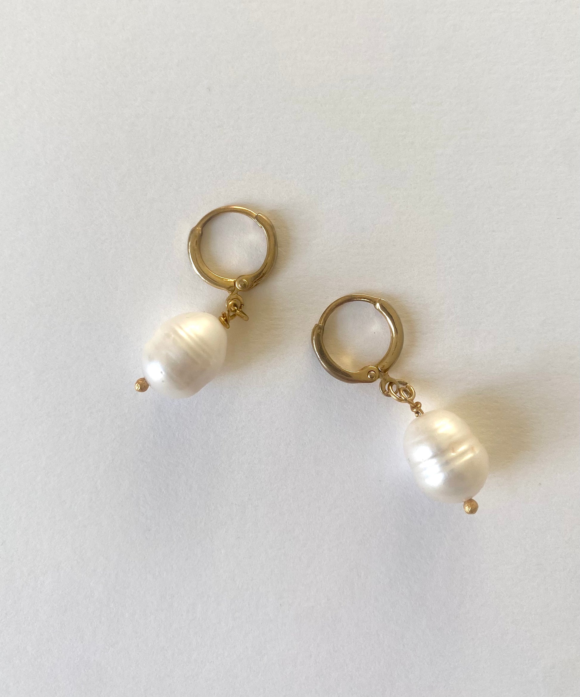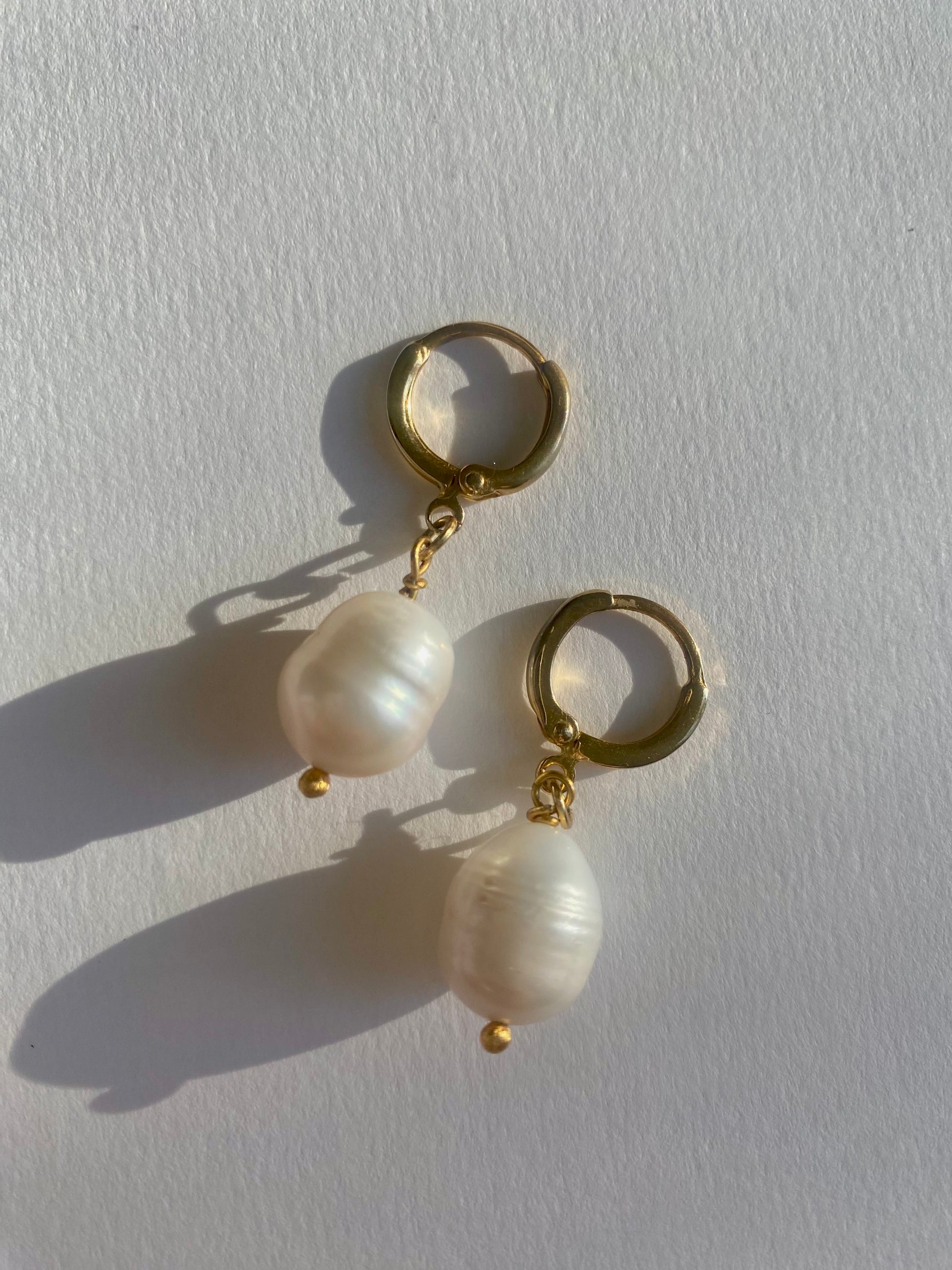 Freshwater pearl earrings, 10mm genuine high lustre pearls, on a delicate gold plated huggie hoop earring.