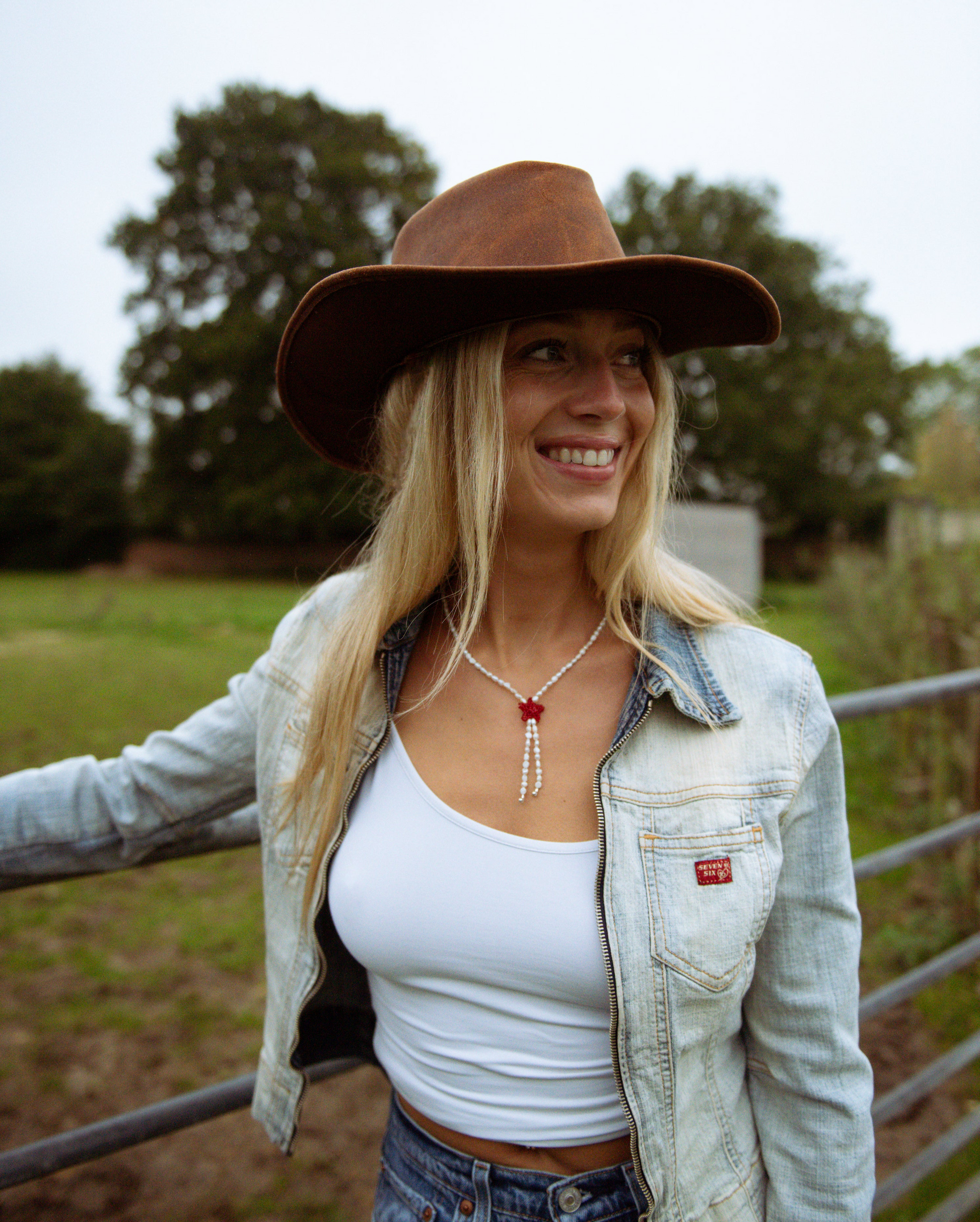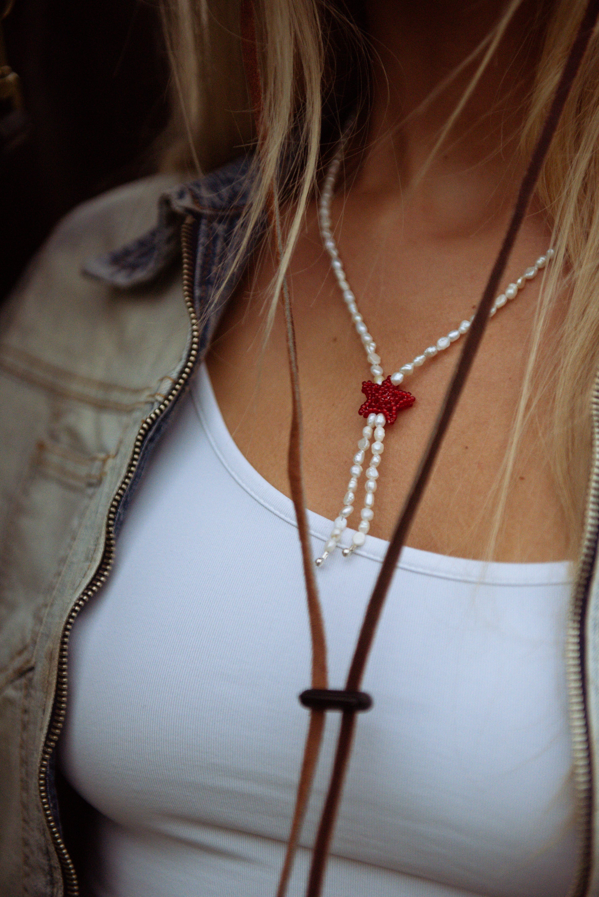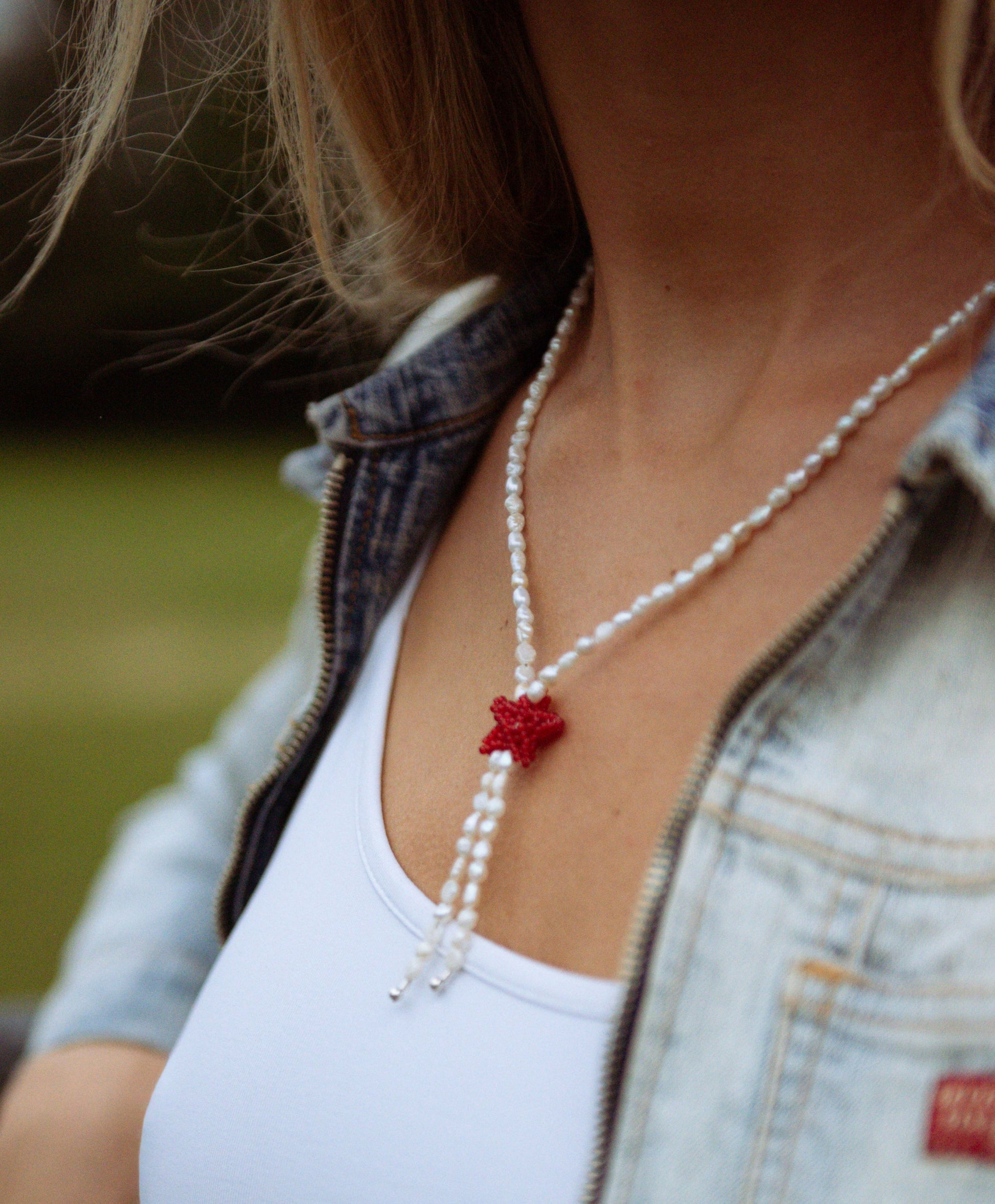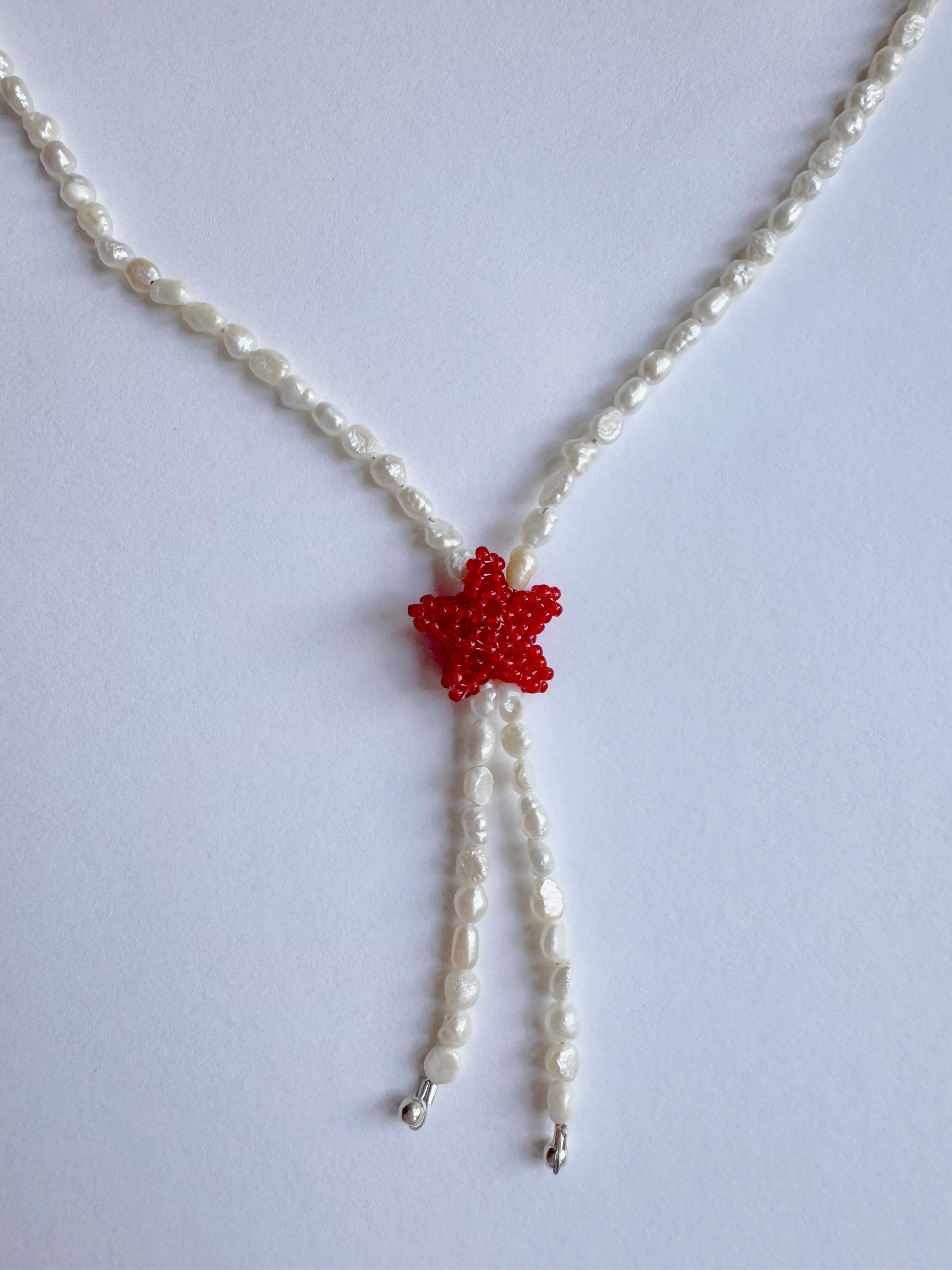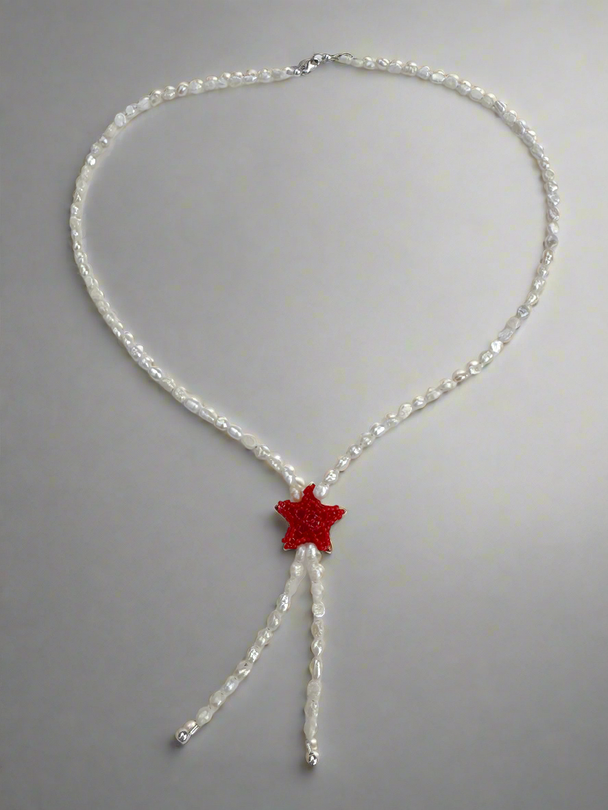 Tiny pearl necklace featuring a cherry coloured beaded chubby star inspired by a western tie lariat.