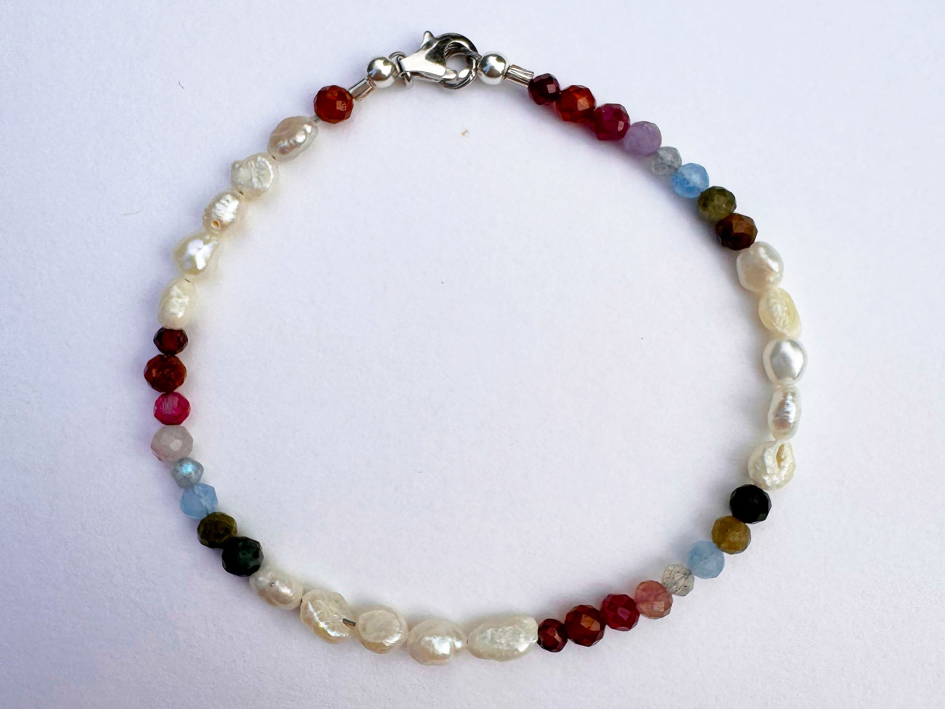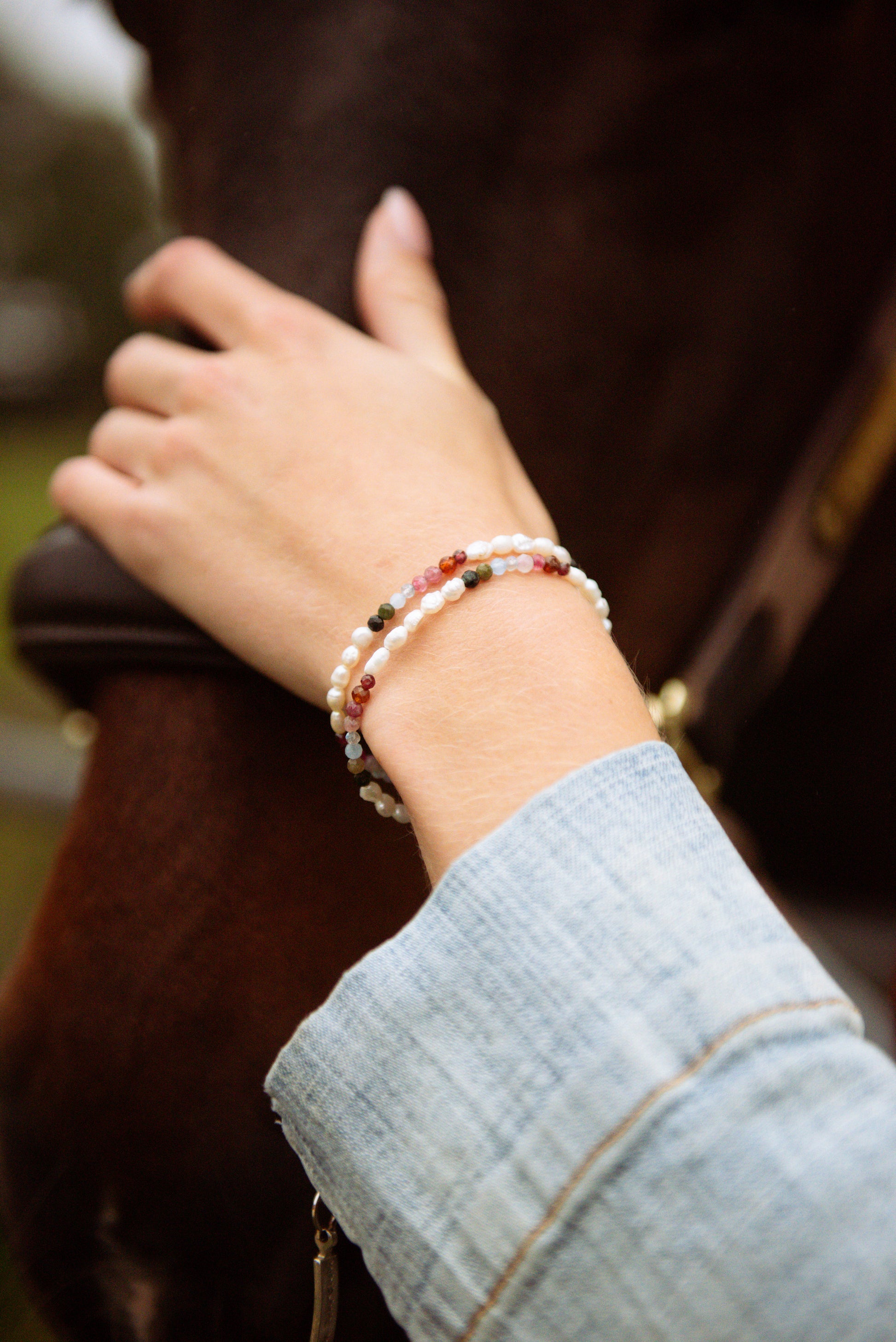 Named after the beloved horse that led this shoot, this bracelet has many different gemstones including tourmalines, calcite, garnets and quartz as well as freshwater pearls.