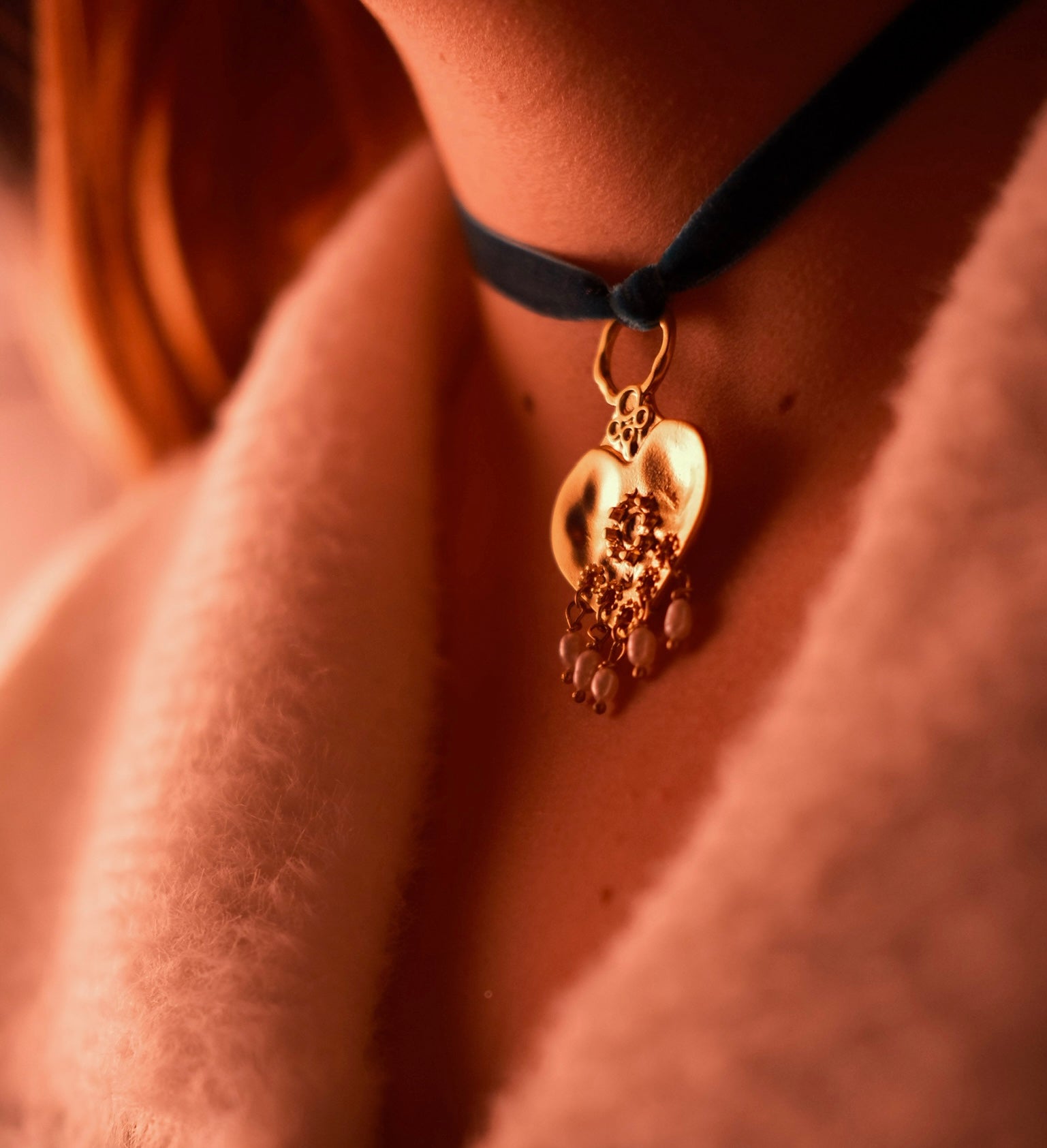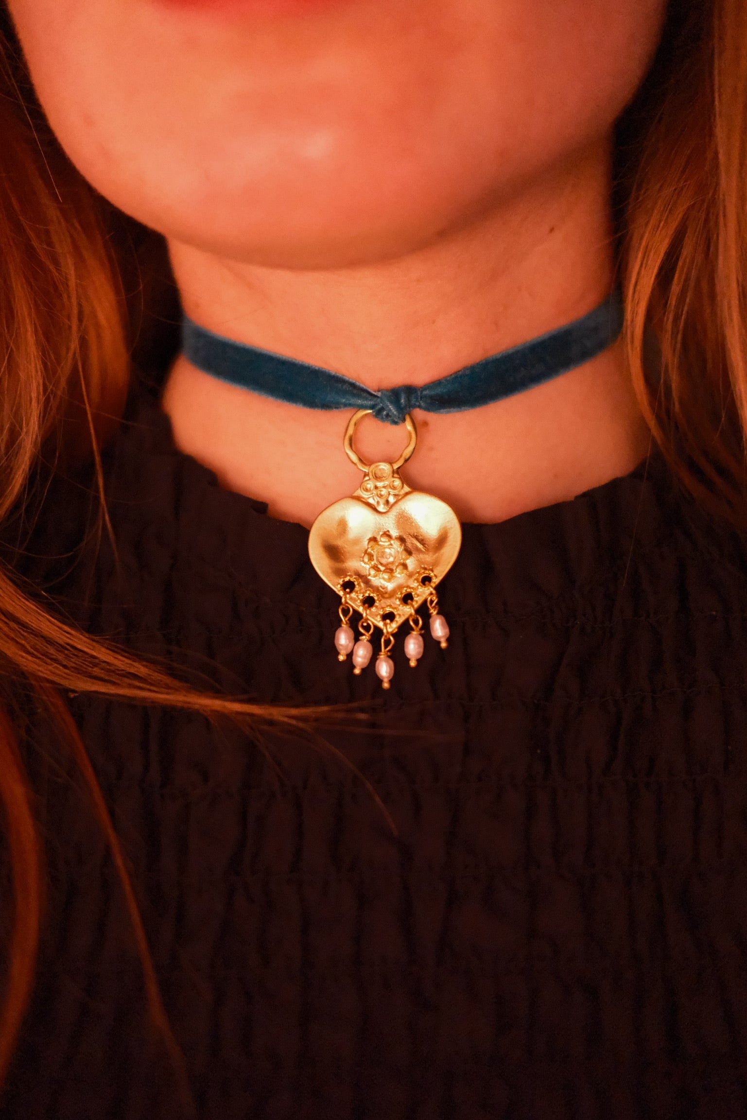 Large gold plated and freshwater pearl Heart pendant threaded and tied onto a luxurious soft, double sided velvet ribbon. Ribbon/necklace is adjustable to be a choker/20 inches long necklace with a ribbon bow at the back. Velvet measures 35 inches, and is available in a blush pink, teal blue (pictured) and forest green.